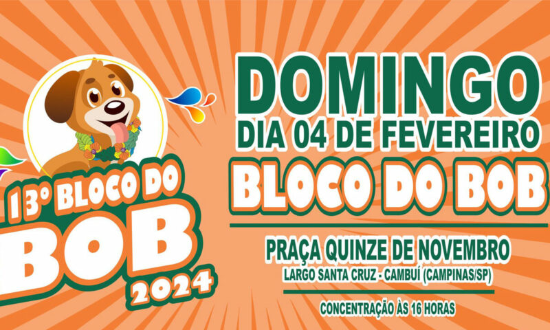 Em busca de repetir o sucesso de 2023, o Bloco do Bob volta com mais uma edição de “Cãonaval”, que chega à sua 13ª edição em 2024. A festa será no domingo de pré-Carnaval, dia 4 de fevereiro, com a concentração no Largo Santa Cruz, no bairro Cambuí, em Campinas, a partir das 16h.
