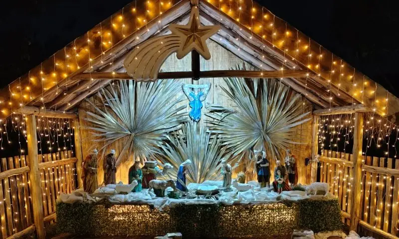 A construção começou em novembro de 2023 e contou com doações e apoio de moradores e amigos. A cobertura foi feita com sapé doado por um amigo de Minas Gerais e, em 2025, o espaço ganhou ainda mais detalhes: moradores colaboraram na compra de pisca-piscas, algumas peças foram adquiridas em Pedreira, e cerca de 30 pessoas participaram diretamente da montagem. Além do presépio, a árvore ao lado também foi iluminada, deixando a praça decorada e acolhedora.