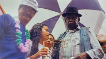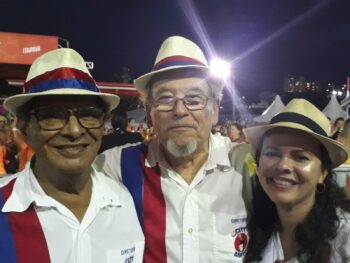 Foto: Geraldo Jorge, a filha Fernanda Guimarães e Jamelão, convidado especial no desfile da City Banda de 1998/arquivo pessoal