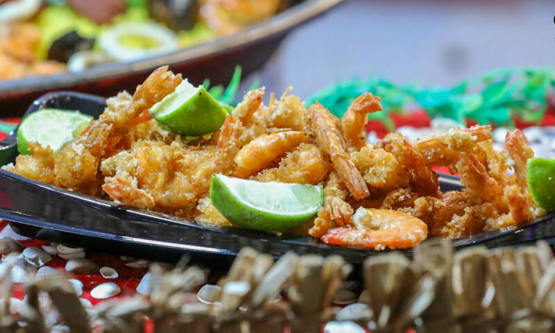 Entre os destaques do menu estão festival de camarão, peixe e frutos do mar, paella espanhola, arroz de jangadeiro, espetos de camarão e uma barca de camarão G, que serve bem quatro pessoas.