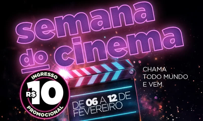 Mais uma campanha “Semana do Cinema” vai ocorrer neste início de 2025, entre os dias 6 e 12 de fevereiro, com promoção de ingressos a R$ 10,00 em salas tradicionais, e descontos em salas especiais e também em combos de pipoca e refrigerante, em várias redes participantes.