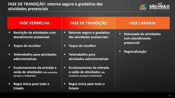A secretária de desenvolvimento econômico, Patricia Ellen, explicou que na fase de transição foram mantidas algumas restrições da fase vermelha, como o toque de recolher e redução da capacidade, e que é diferente da fase laranja, que prevê capacidade de 40%, sem toque de recolher, entre outros itens. “Estamos trazendo esta fase de transição, um período de duas semanas, para mostrar a capacidade de trabalharmos juntos, respeitando e fazendo o trabalho de proteger vidas, proteger empregos e combater a fome”, disse.