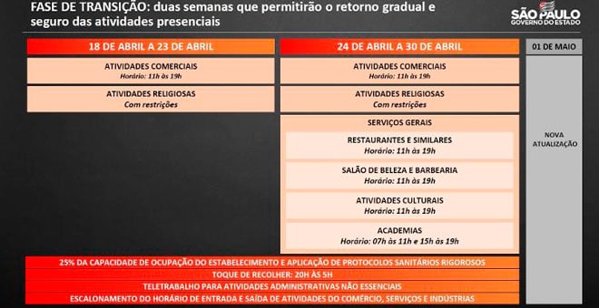O governo de São Paulo anunciou nesta sexta-feira, 16 de abril, que o estado passa a adotar a chamada fase de transição no Plano São Paulo para a retomada dos setores econômicos a partir de domingo, dia 18 de abril, com abertura do comércio e liberação dos cultos religiosos. Já o setor de serviços, que inclui restaurantes, salões de beleza, academias e atividades culturais poderão voltar às atividades presenciais a partir da semana seguinte, no sábado, 24 de abril. Bares continuam proibidos.