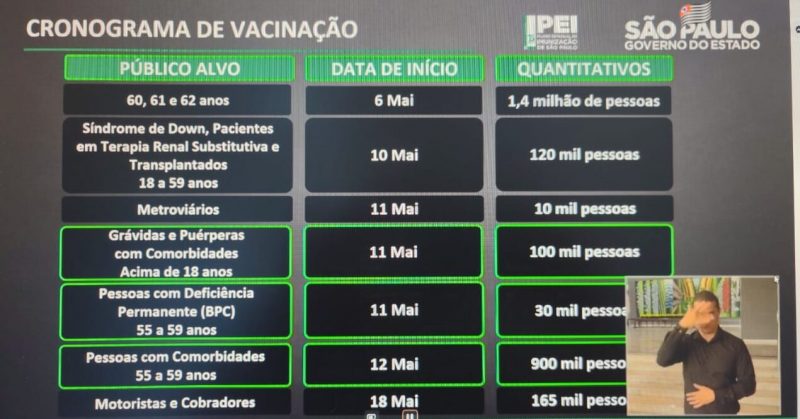 No dia 11 de maio começa a vacinação das gestantes e puérperas (até 45 dias após o parto) com idade acima de 18 anos e com comorbidades, totalizando 100 mil mulheres no estado. A partir dessa data, também serão imunizadas as pessoas com deficiência permanente que têm entre 55 e 59 anos e recebem benefício de prestação continuada da assistência social, o BPC. Serão contempladas outras 30 mil pessoas neste grupo.