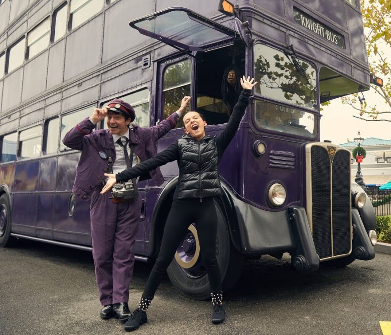 da Netflix, posou para foto no dia 29 de dezembro em frente ao Knight Bus no