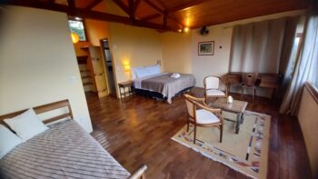 Com vista para as montanhas, sala com lareira e frigobar, ventilador de teto, cama queen e possibilidade de acomodar uma terceira pessoa em uma cama de solteiro.