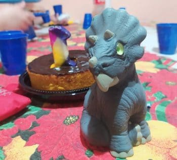 No vídeo, Guilherme apresenta seu amigo. Um Tricerátops, bebê, ainda com seus chifres em formação, com seus olhos verde-amarelos arregalados. O bichinho era um sonho de consumo do meu sobrinho-neto. Quando ele tinha três aninhos, em uma visita à casa de seu primo Felipe, ficou encantado com aquele ovo branco na prateleira ao lado de uma coleção de dinossauros. Quase perdeu o fôlego quando, ao ser aberto, viu dentro do ovo o dinossaurinho herbívoro. Anos atrás, o dei de presente ao então adolescente Felipe, meu sobrinho e afilhado. Em várias oportunidades, o Gui até tentou levar o dino para sua casa. Mas, não conseguiu e recusou, com desprezo, outro Tricerátops, laranja, adulto, e sem os olhos simpáticos do filhote. Desta vez, sabendo falar com propriedade, insistiu, por que não?