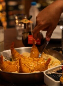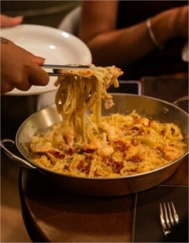 Cardápio variado, especializado em camarões e frutos do mar, mas com opções para todos os gostos, dentre aves, carnes, massas, saladas, entradinhas, drinks diferenciados e sobremesas irresistíveis.