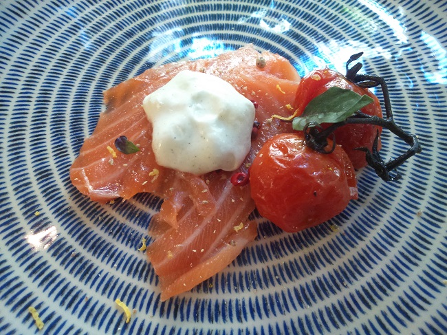 Salmão cru, espuma de jambu com cachaça, pimenta-rosa e tomates confitados