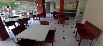 O café da manhã também é servido para hóspedes e visitantes neste mesmo espaço, com um variado buffet composto por frutas, frios, queijos diversos, pães, bolos, ovos mexidos, chás, cafés, leites, capuccino, iogurtes, sucos variados, cereais, geléias, dentre outros.
