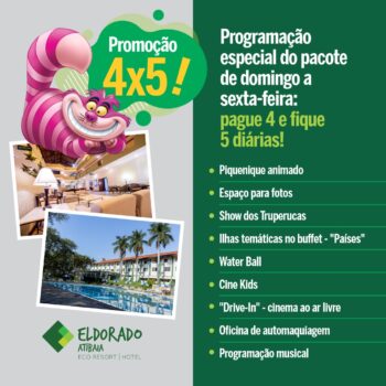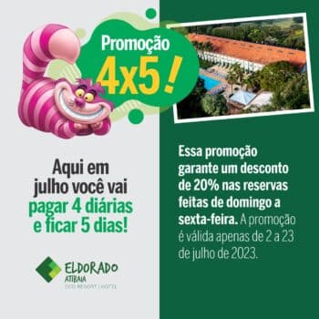 O Eldorado Atibaia está oferecendo uma promoção imperdível em julho: pague 4 e fique 5 dias de domingo a sexta-feira.