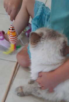 Para a Milena e o Vitor, os gatinhos conversam, sentem, existem, interagem. Não estão em lados opostos. Por isso, a compaixão em seus olhos ao responder que a Pikachu estava passando mal. Filhinha, mãe e pai se compadeceram desse sofrimento e desejaram melhoras. Agradeci, sai apressada. Era uma quarta-feira à noite. No dia seguinte, enquanto o sol sumia entre vãos dos prédios e da catedral de Campinas, escutei um toque-toque. Não era a campainha estridente a pôr o gato assustado a se esconder em um dos seus esconderijos. Não! Um toque-toque gentil, quase receoso. Abri a porta e vi Milena e a mãe. A pequena vizinha trazia presentes para a Pikachu e o Gattino. Uma bolinha rosa com guizo e um ratinho amarrado em um cordão elástico preso a uma varinha, mágica. Desejosas de notícias da Pikachu, fui de cômodo em cômodo, toca em toca, atrás da gatinha e a levei até elas.