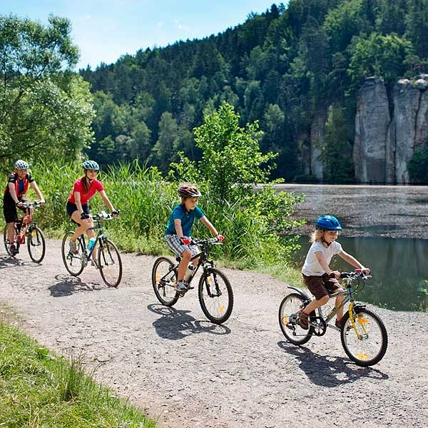 No Paraíso de Boêmia, os ciclistas têm à sua disposição uma ampla gama de roteiros sinalizados. A primeira delas é a Rota Hrubá Skála, de dificuldade média e 16 km de extensão, que começa no antigo balneário de Sedmihorky e passa por um dos mais belos palácios do Paraíso Boêmio, o Hrubá Skála, localizado em uma imponente plataforma rochosa coberta de florestas. A partir daqui você entrará no mundo fabuloso da cidade rochosa de Hrubá Skála, com mais de 200 rochas de até 60 m de altura. Se gosta de ruínas, não hesite em visitar outros locais no caminho como as ruínas do castelo gótico de Wallenstein. O percurso termina em Kacanovy, onde você pode relaxar o corpo cansado desfrutando de uma boa pausa na piscina ou descansando na praia local – de água doce.