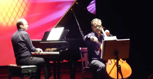 Eu já conhecia o Raïff, que solou no início do mês passado com a Sinfônica de Campinas no Teatro Castro Mendes, primeiro violoncelo da Sinfônica do Teatro Municipal de São Paulo, onde toca há 18 anos, um dos mais renomados cellistas brasileiros. Mas não conhecia o pianista Rogério Zaghi, atual coordenador de programas educacionais da Osesp. Foi uma grata surpresa descobrir que ele é um pianista excelente, dos melhores que já vi fazendo música de câmara. Fraseado elegante, limpíssimo e elegante, dinâmicas impecáveis, grande musicalidade e apuro técnico. Isso tudo fui percebendo ao longo da apresentação e mais ainda na Sonatina. Depois, conversando com o Rogério, fiquei sabendo que ele trabalhou anos como correpetidor (pianista que acompanha cantores líricos e corais) e, disse isso a ele, creio que isso explique toda essa delicadeza e refinamento, que me lembrou muito aquele que pra mim é o melhor pianista deste gênero no Brasil, Ricardo Ballestero.