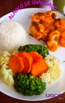 ALMOÇO: Pratos com filé de frango grelhado, salmão ou saint peter grelhados, escalope de mignon e massa vegana.