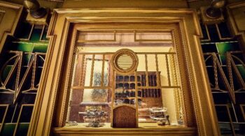 Um lustre brilhante ilumina o antigo escritório de Dolores Umbridge, que se revela tão exagerado quanto a própria mulher, com seus tons de rosa e esculturas douradas ornamentadas por toda parte. Aqui, os visitantes conhecerão Higgledy pela primeira vez, a ex-elfa doméstica de Umbridge, enquanto ela limpa o escritório antes do julgamento.