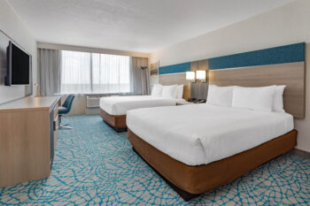 O hotel tem 436 quartos e suítes confortáveis, serviço de bufê delicioso e comodidades convenientes, como duas piscinas externas aquecidas, academia e quadras de tênis.
