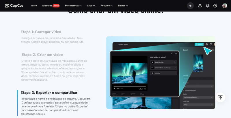 Ademais, caso seja necessário, passe o conteúdo em um conversor de vídeo online, como o CapCut, para que seu vídeo fique no formato adequado para as redes sociais e use os seguintes truques: